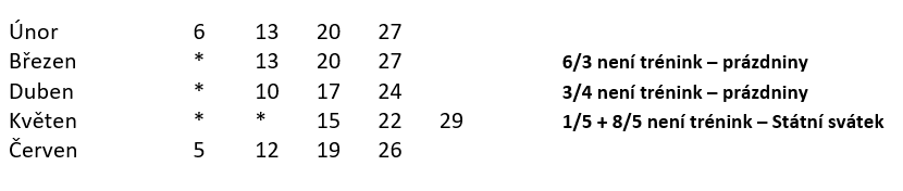 * znamená, že v dané datu není v pátek trénink 🙂 .